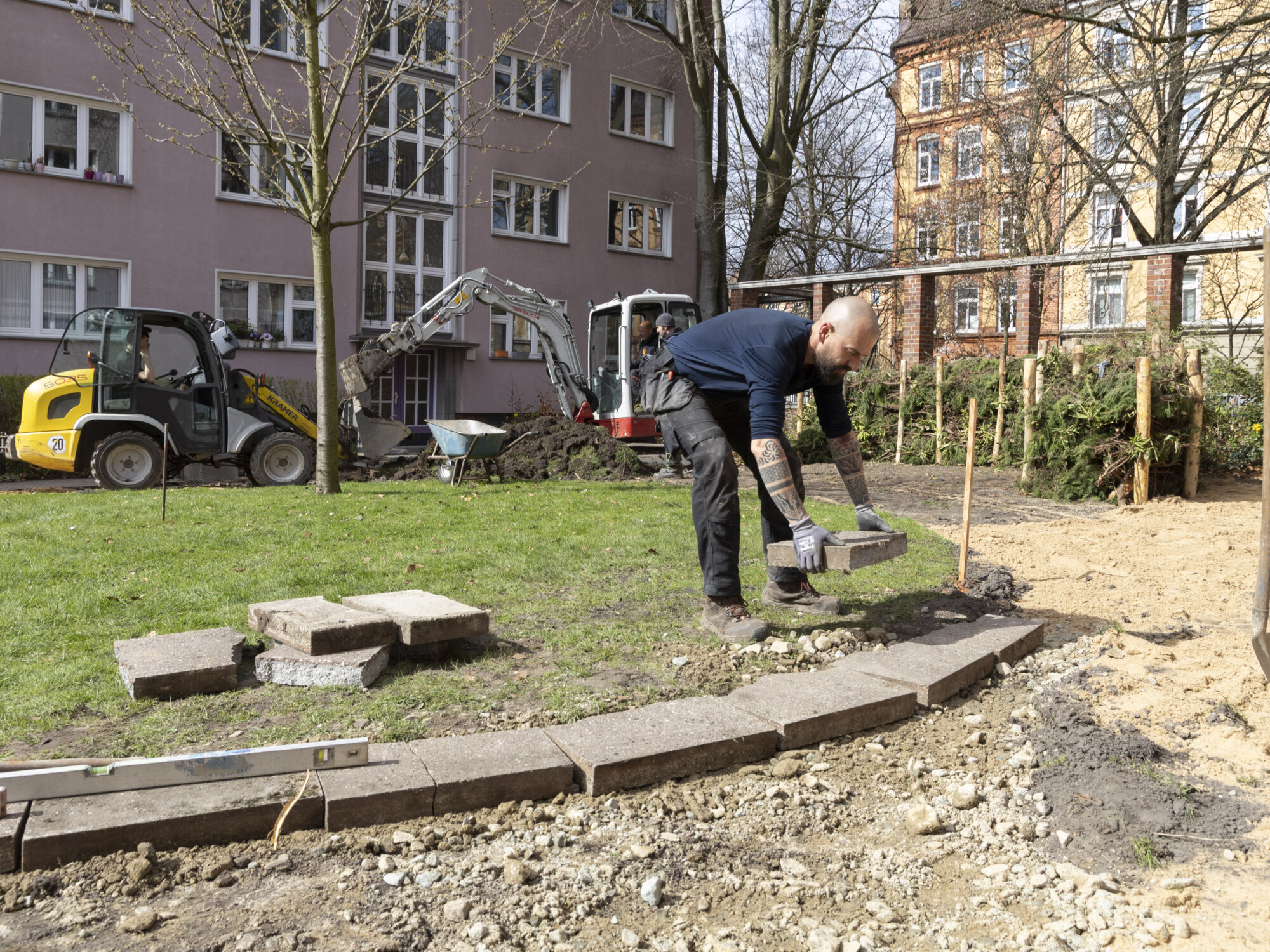 Seit dem 30.03.2026 läuft die Umbaumaßnahme durch BIOTOP. Schon nach kurzer Zeit sind die Fortschritte beeindruckend (s. Fotogalerie unten). Nachhaltigkeit steht bei dem gesamten Projekt hoch im Kurs. So kommt das Schnittgut in der Benjeshecke weiter zum Einsatz, und die Gehwegplatten, die später ersetzt werden, bekommen eine „neue Bestimmung“ in der Natursteinmauer.